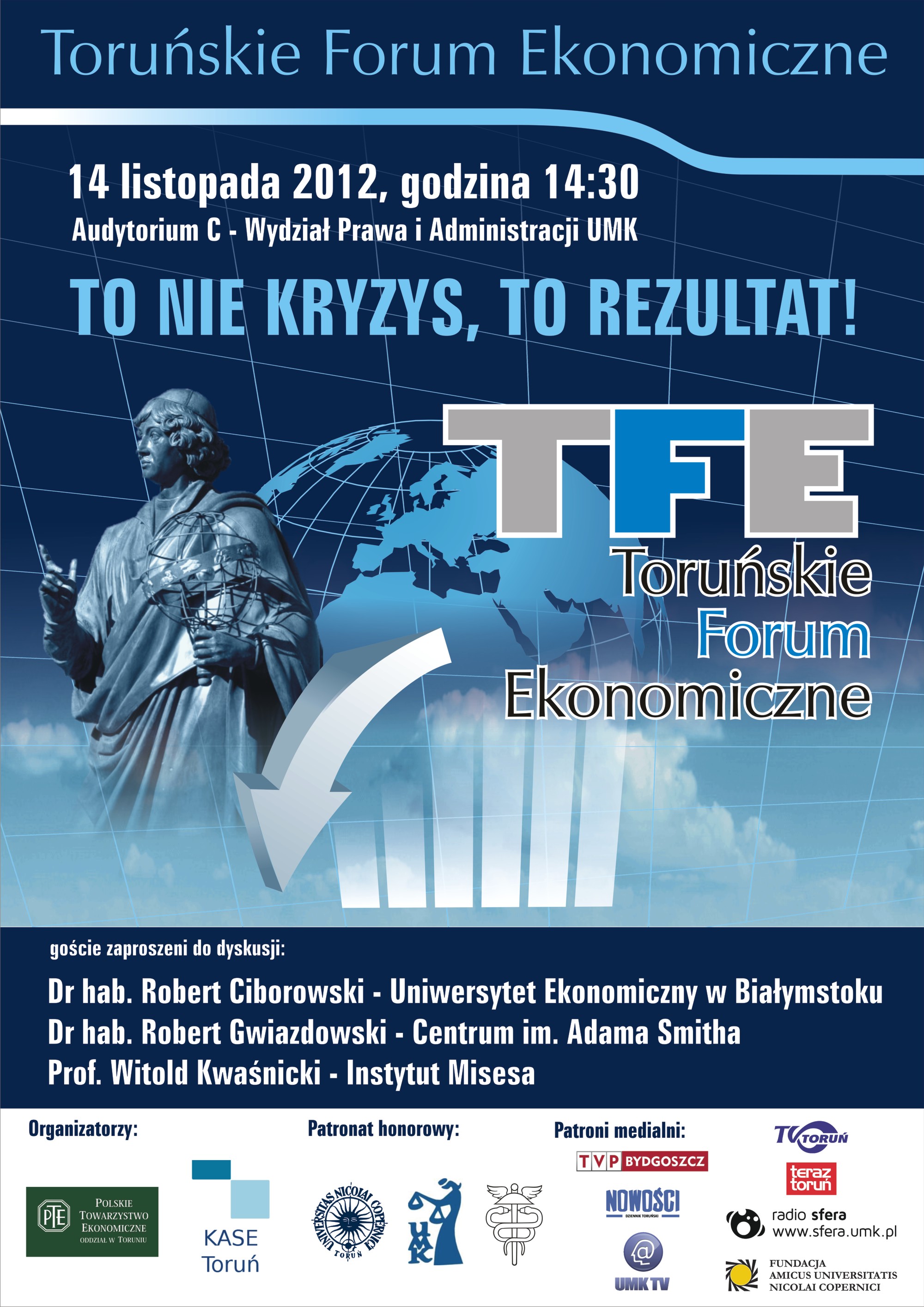 Tegoroczne Toruńskie Forum Ekonomiczne odbywa się pod hasłem: „To nie kryzys, to rezultat!” i jego głównym celem jest próba wyjaśnienia złożonych mechanizmów ekonomicznych, które często w mass mediach są spłycane oraz błędnie interpretowane przez komentatorów.