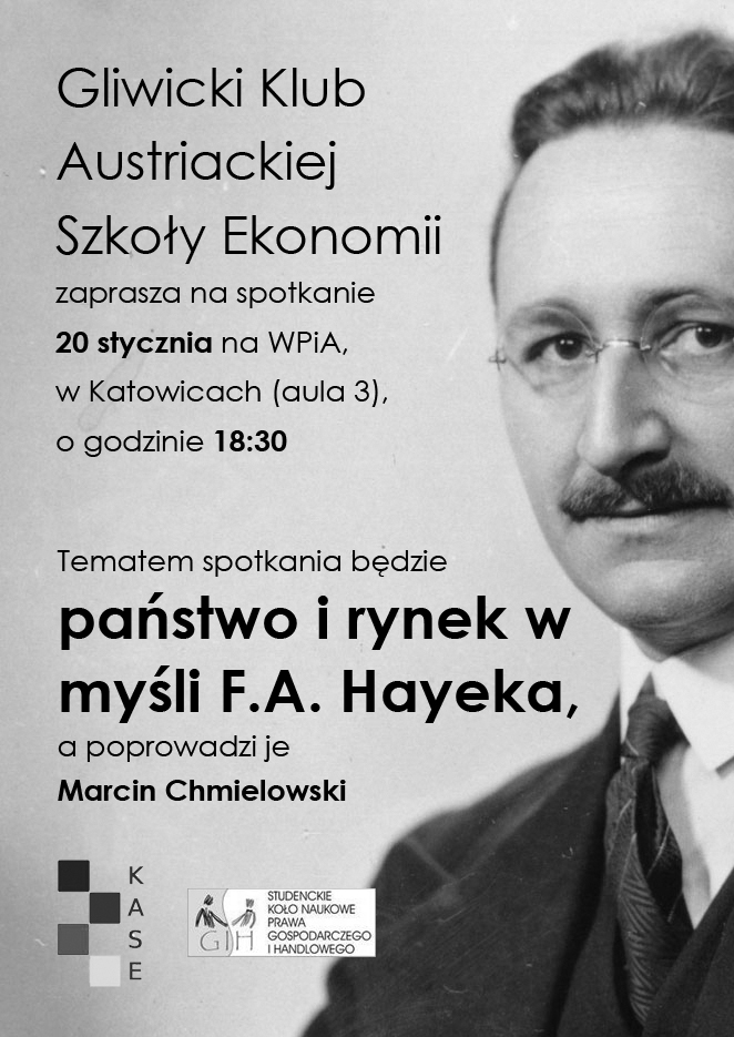 Gliwicki Klub Austriackiej Szkoły Ekonomii zaprasza na spotkanie 20 stycznia na WPiA, w Katowicach (aula 3), o godzinie 18:30. Tematem spotkania będzie „Państwo i rynek w myśli F.A. Hayeka”, spotkanie poprowadzi doktorant UP w Krakowie Marcin Chmielowski.
