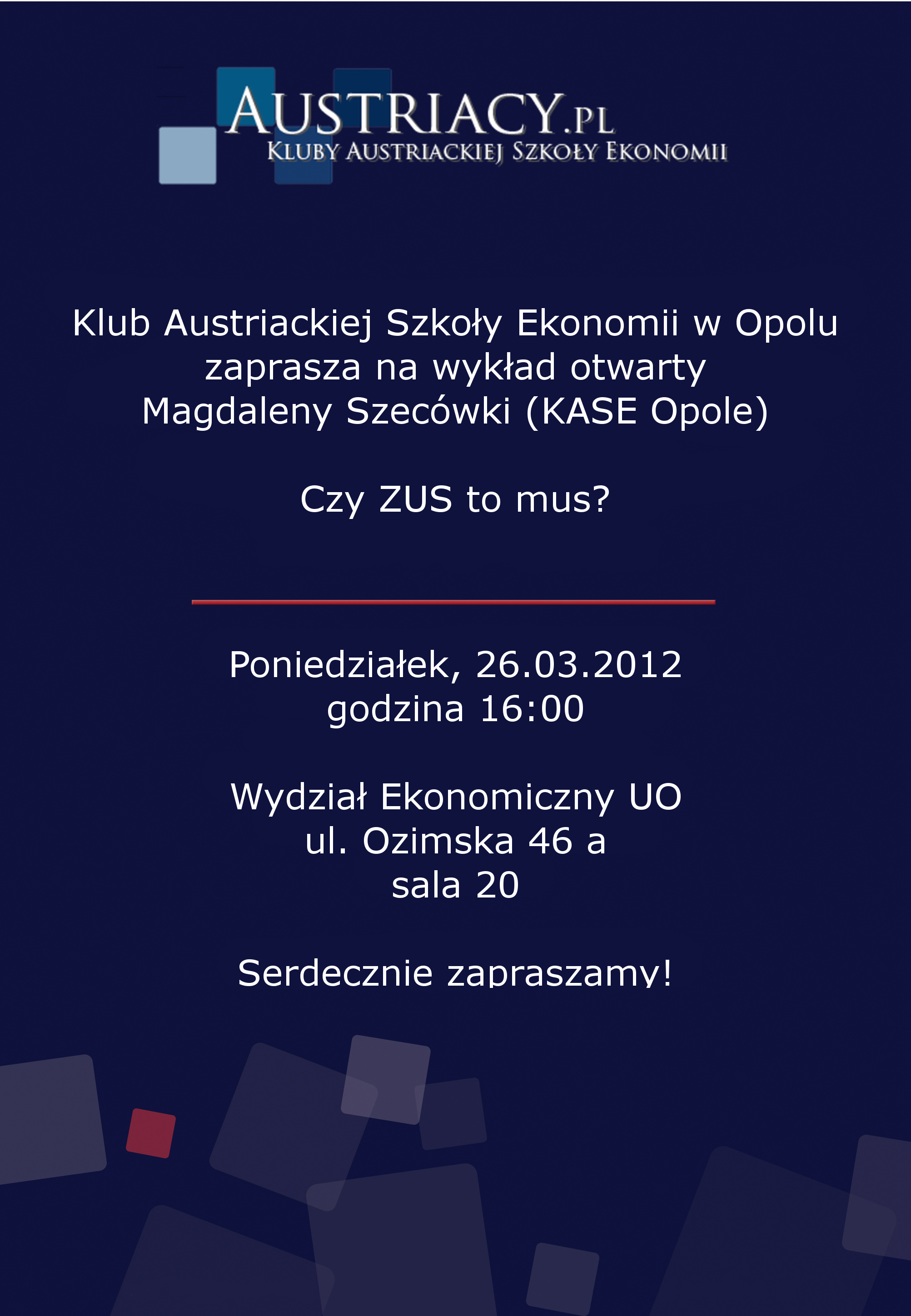 Spotkanie odbędzie się 26 marca o godz. 16:00 w sali nr 20 Wydziału Ekonomicznego Uniwersytetu Opolskiego (ul. Ozimska 46 a).